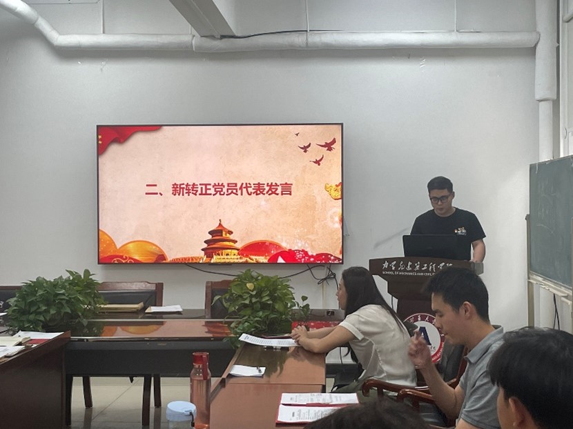 硕2020-2党支部李辉作为新转正党员代表发言。李辉表示,作为一名新转正党员,责任深感重大,回顾自己的党性成长历程,感悟到党的教育和引导对于个人的思想建设的重要性,将以此为契机,在未来的工作中不断提升自己的能力,努力成为一名优秀的共产党员。