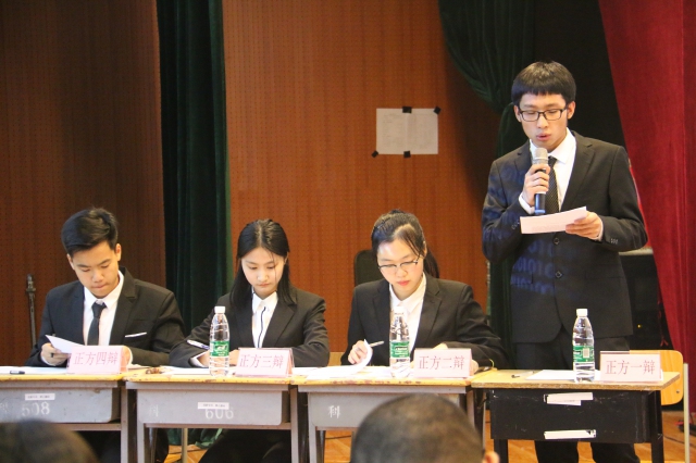 随之而来的自由辩论环节将整场比赛彻底推向高潮!正方二辩利用精辟的措辞,犀利的语句,拿出了仿佛令对方招架不住的气势,而反方一辩毫不畏惧,侃侃而谈,一番话语冷厉而又致命,展现出咄咄逼人的气势。你有哲理盾,我有事实矛,谁也不甘下风!在这样更加激烈的赛场上,反方辩手旁征博引,正方辩手妙语连珠,双方气势如虹,你来我往,争分夺秒,打出一记记让胜利的天平倾斜的辩语,比赛瞬间进入白热化!时间迅速流失,比赛进入结辩环节。
