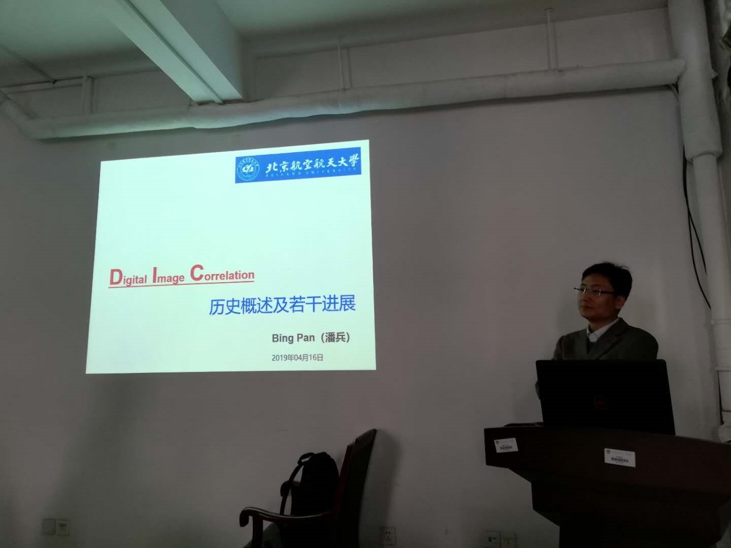 报告会上,潘兵教授先通过生动、形象的例子,阐述了当前DIC在变形测试领域中的重要位置,综述了DIC发展的3个不同阶段,介绍DIC的基本原理——如何通过图像技术获得物体极其微小的变形和其他力学参量,并对不同时期学者在固体变形测量的数字图像相关方法(DIC)基础理论及其应用研究方面成就进行了深入、系统的讲解。最后,介绍了自己科研团在该领域所做的一些贡献,提出被普遍采用的标准位移和应变测量算法,解决了该方法中一系列基础理论问题和关键难题;解决了高温热辐射干扰难题和高温高速气流环境中散斑制作难题,首次实现石英灯辐射加热下和高温电弧风洞中的极高温变形测量。